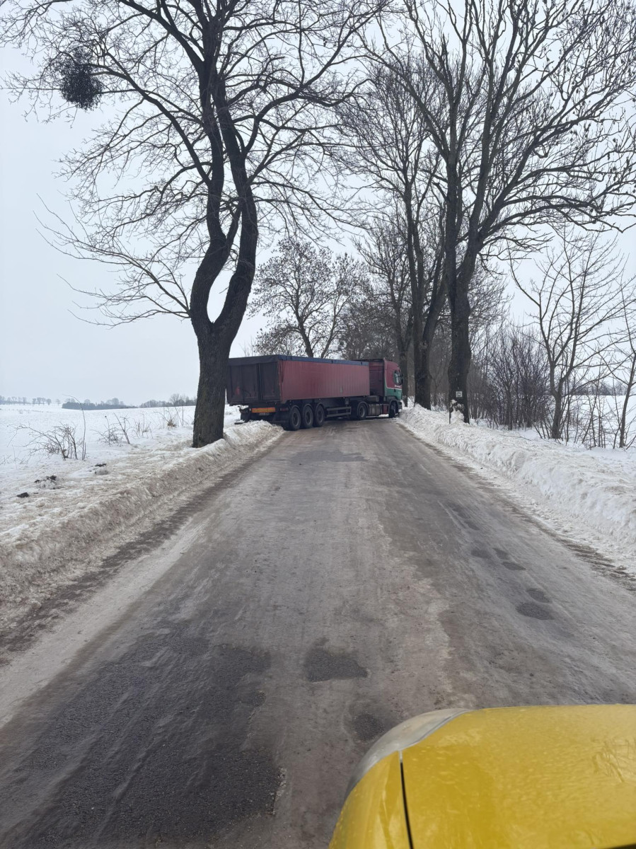 W poprzek drogi między Smykowem a Brzydowem stanął samochód ciężarowy i blokuje przejazd. Na miejscu pracuje pługopiaskarka.