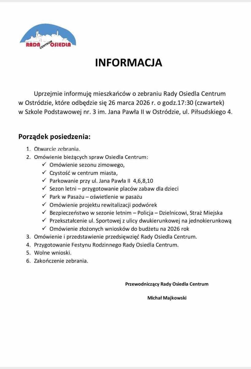 Rada Osiedla przedstawi ponadto swoje dotychczasowe przedsięwzięcia oraz rozpocznie przygotowania do Festynu Rodzinnego Rady Osiedla Centrum. Tradycyjnie na zakończenie spotkania przewidziano czas na wolne wnioski mieszkańców, którzy będą mogli zgłaszać własne pomysły i problemy.