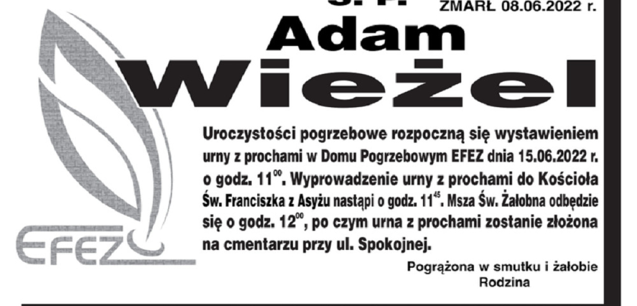 Ostatnie pożegnanie Adama Wieżela odbędzie się w środę, 15 czerwca, po czym zmarły spocznie na cmentarzu przy ul. Spokojnej.