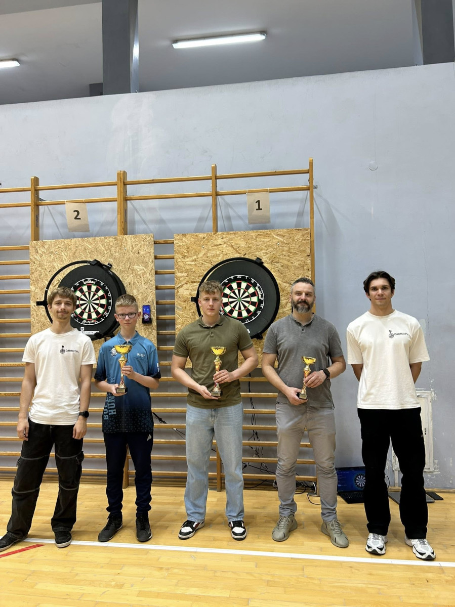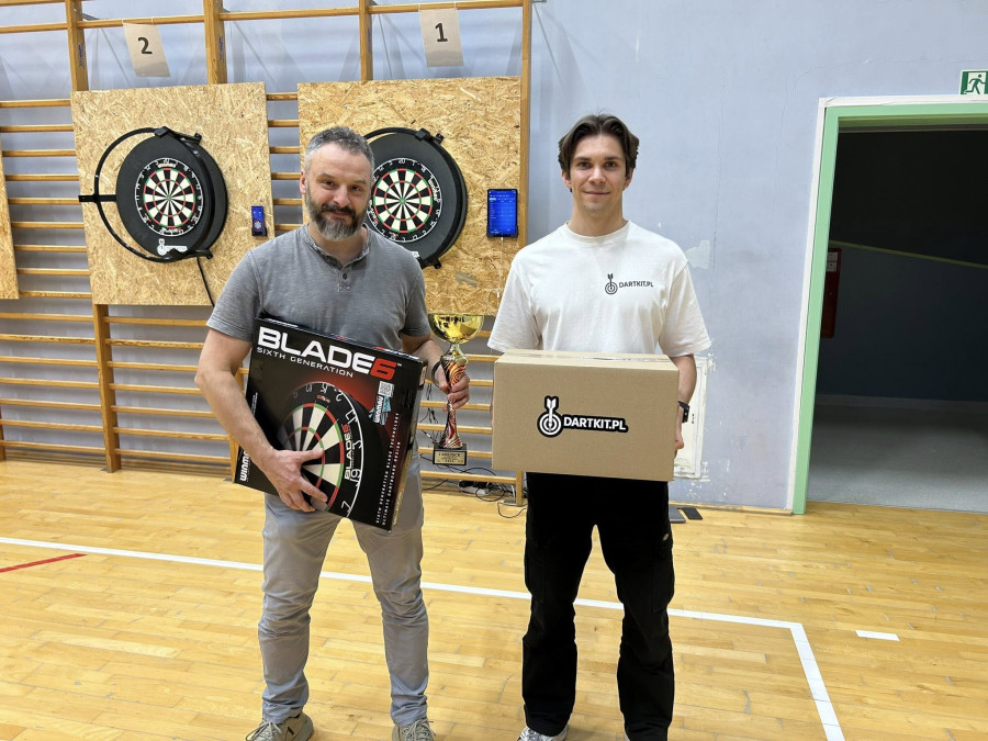 Zwycięzca z Ostródy odebrał pamiątkowy puchar, profesjonalną tarczę Winmau Blade 6 oraz zestaw do automatycznego liczenia punktów od DartKit. Łączna wartość nagród wyniosła 1000 złotych! 👏