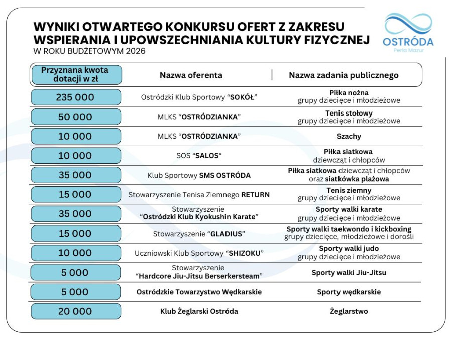 Miasto Ostróda rozstrzygnęło konkursy ofert na realizację zadań z zakresu wspierania i upowszechniania kultury fizycznej oraz rozwoju sportu w roku budżetowym 2026. Środki trafią do lokalnych klubów, stowarzyszeń i organizacji sportowych prowadzących szkolenie dzieci, młodzieży oraz dorosłych.