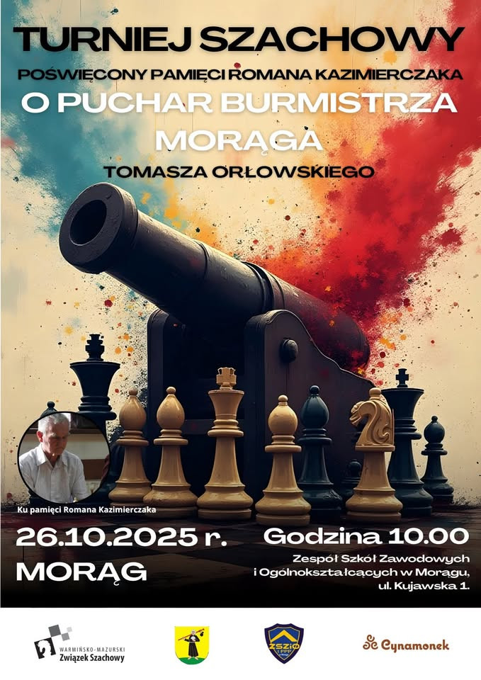 Już w niedzielę 26 października w Morągu grając w szachy uczczą pamięć nieodżałowanego Romana Kazimierczaka. Turniej zaliczany do klasyfikacji cyklu Grand Prix Województwa Warmińsko-Mazurskiego w Szachach Szybkich 2025 rozpocznie się o godz: 10:00 w Zespole Szkół Zawodowych i Ogólnokształcących w Morągu, przy ul Kujawskiej.