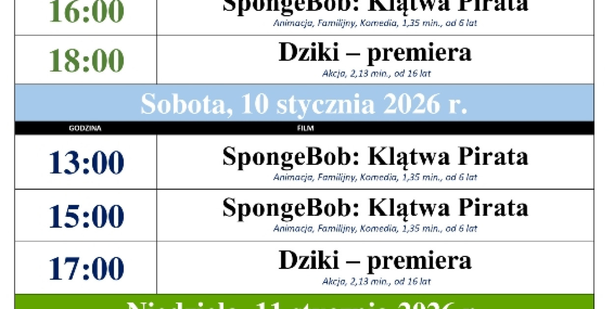 sobota 10 stycznia, 11:00, 13:00; 14:000; 15:00; 16:00; 17:00; 18:00