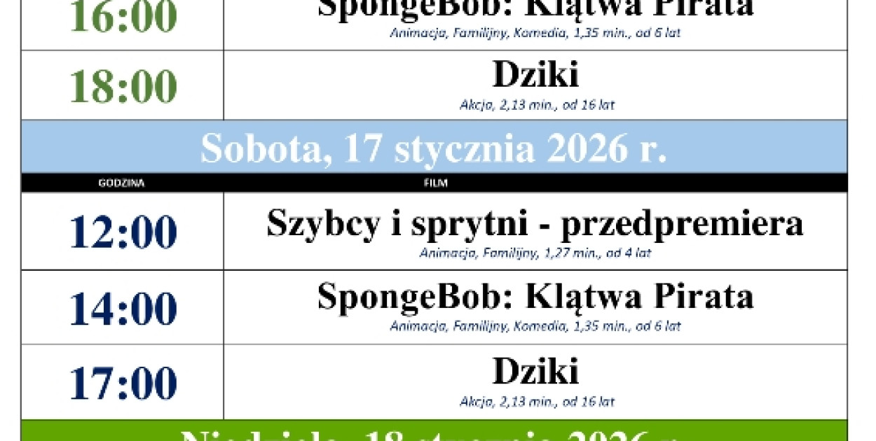 piątek 16 stycznia, 11:00; 12:00; 13:00; 14:00; 15:00; 16:00; 17:00; 18:00