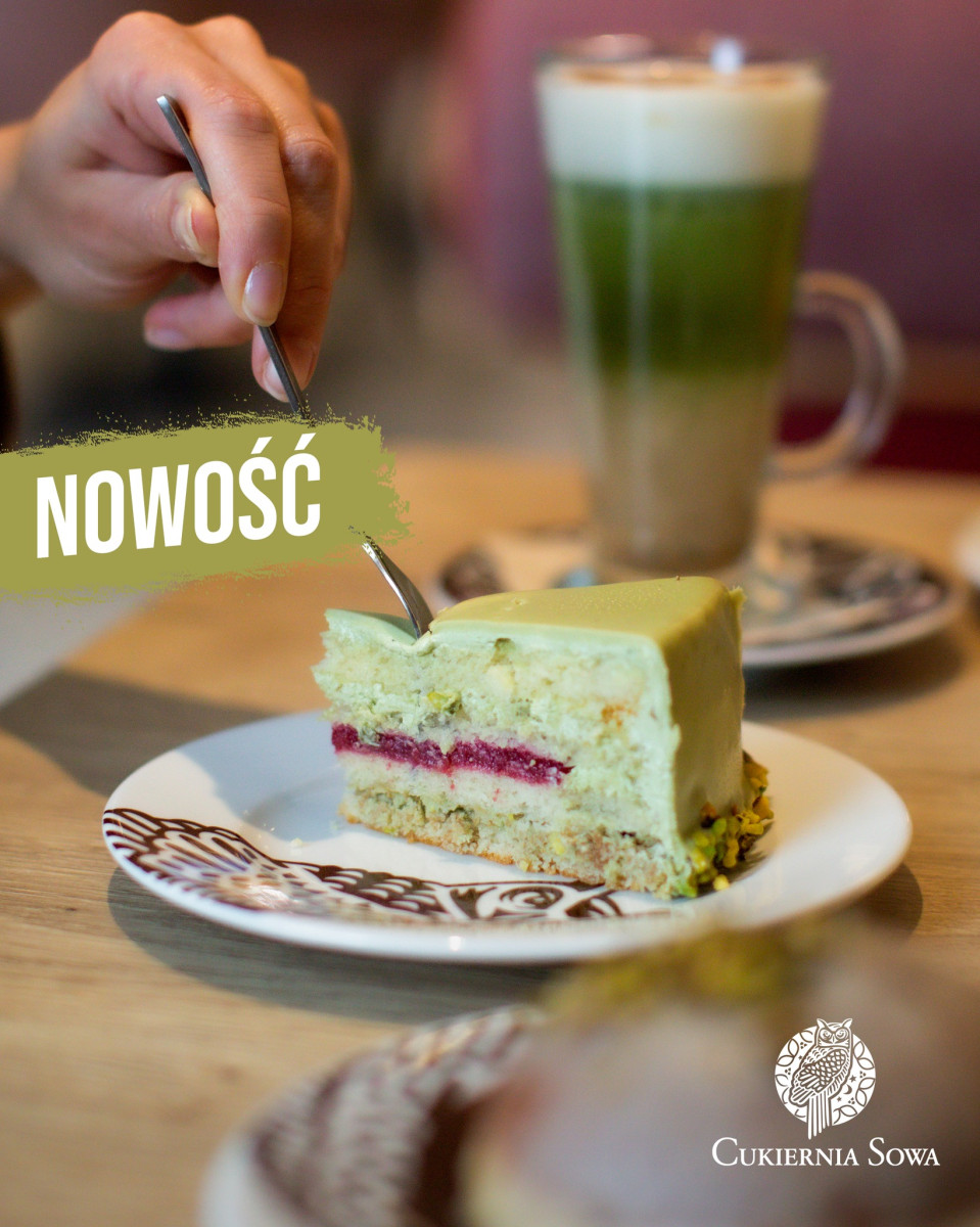 Tort pistacjowy to jasny biszkopt, aksamitny krem pistacjowy, warstwa chrupkiego kremu pistacjowego i malinowa markiza, a do tego polewa w odcieniu eleganckiej, seledynowej zieleni .