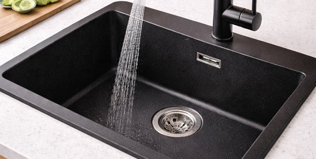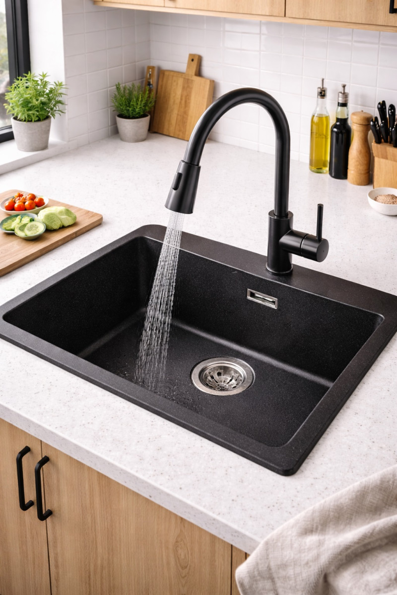 Czarny zlewozmywak granitowy jednokomorowy to wybór dla osób, które chcą mocnego akcentu aranżacyjnego.