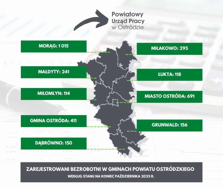Największy przyrost zanotowano w Mieście Ostróda (+11 osób) oraz w gminach Ostróda i Grunwald (+10). Spadek liczby osób bez pracy wystąpił jedynie w gminie Łukta (–6).