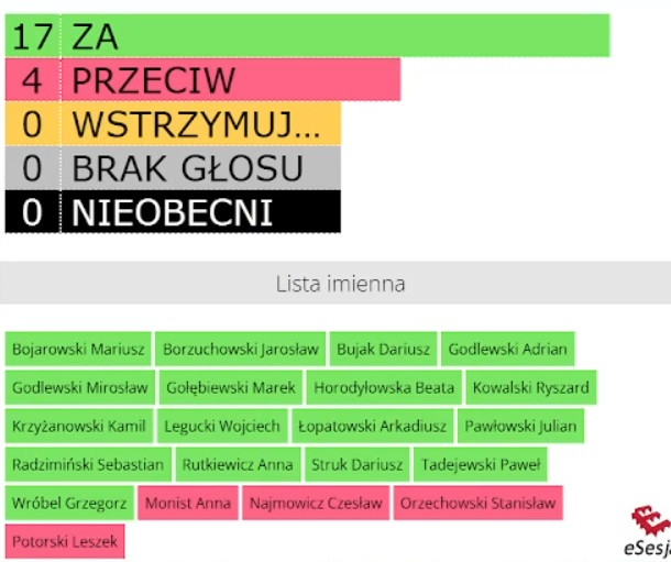Za uchwałą było 17 radnych, 4 osoby były przeciwne. jak kto głosował zobaczycie na grafice pod artykułem.