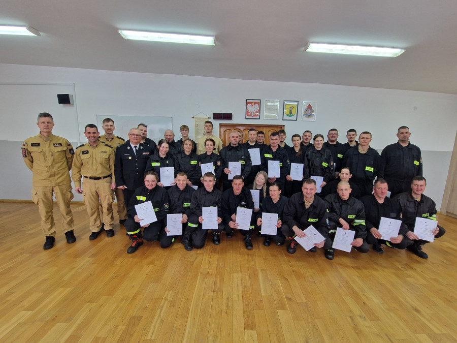 Zaświadczenia potwierdzające ukończenie szkolenia wręczyli st. kpt. Łukasz Zaniewski, Zastępca Komendanta Powiatowego PSP w Ostródzie, oraz dh. Ryszard Harasim, prezes zarządu powiatowego ZOSP RP w Ostródzie.