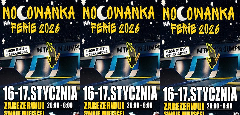 Nocka w JumpWorld Ostróda na start ferii zimowych 2026 - tak zaczną się ferie zimowe w Parku Trampolin JumpWorld Ostróda, których dzieci nie zapominają do końca roku! Przed nami wyjątkowa nocka pełna zabawy i niespodzianek!