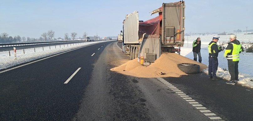Nidzica: Zboże na na drodze ekspresowej S7 po zderzeniu dwóch ciężarówek