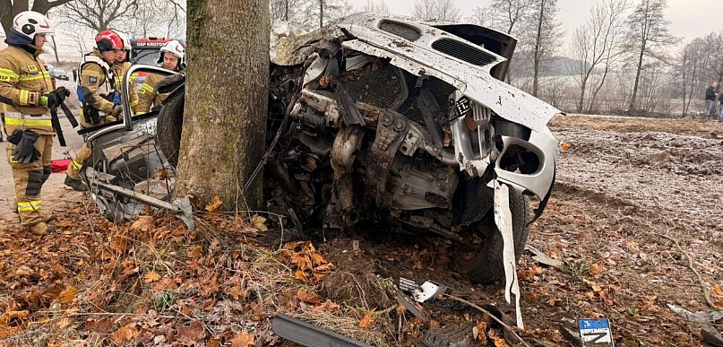Gm. Biskupiec: Mitsubishi z 5 osobami uderzyło w drzewo, na miejscu LPR